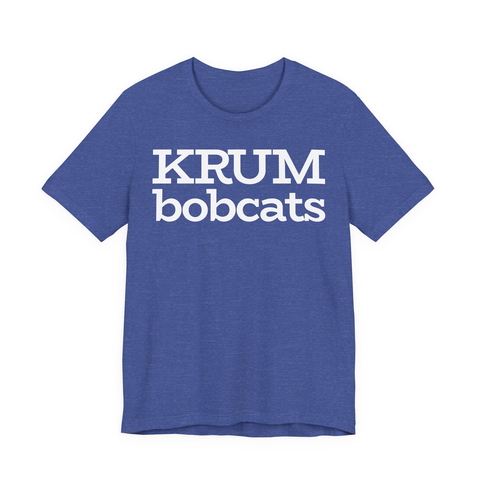 A unisex jersey short sleeve tee in Krum blue with serif font of Krum Bobcats. This shirt offers a classic and comfortable style, perfect for casual wear or showing school spirit at games and events. Relevant to students, alumni, and fans of the Krum Bobcats, suitable for back-to-school, sporting events, and alumni reunions. Product features - Unisex fit suitable for adults - Made with 100% lightweight Airlume combed and ring-spun cotton - Classic crew neckline for versatile styling - Manufactured in a sustainable and humane manner - Variety of fabric blends available for different colors Care instructions - Machine wash: cold (max 30C or 90F) - Non-chlorine: bleach as needed - Tumble dry: low heat - Iron, steam or dry: medium heat - Do not dryclean