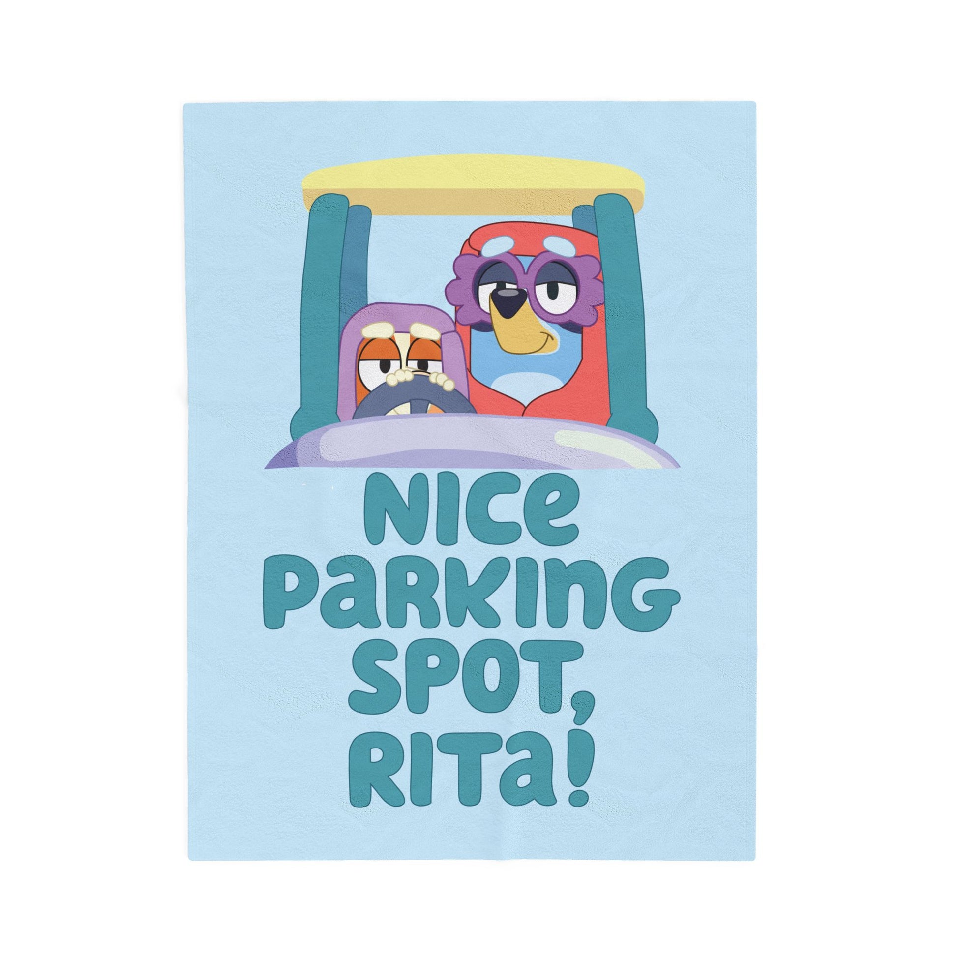 A cozy velveteen plush blanket featuring a unique design with bluey grannies, a nice parking spot, and Rita. This blanket gives off a warm and inviting vibe, perfect for snuggling up on the couch or adding a pop of color to any room. Ideal for anyone looking for a touch of whimsy in their home decor, this blanket is great for gifting during birthdays, holidays, or housewarmings.
